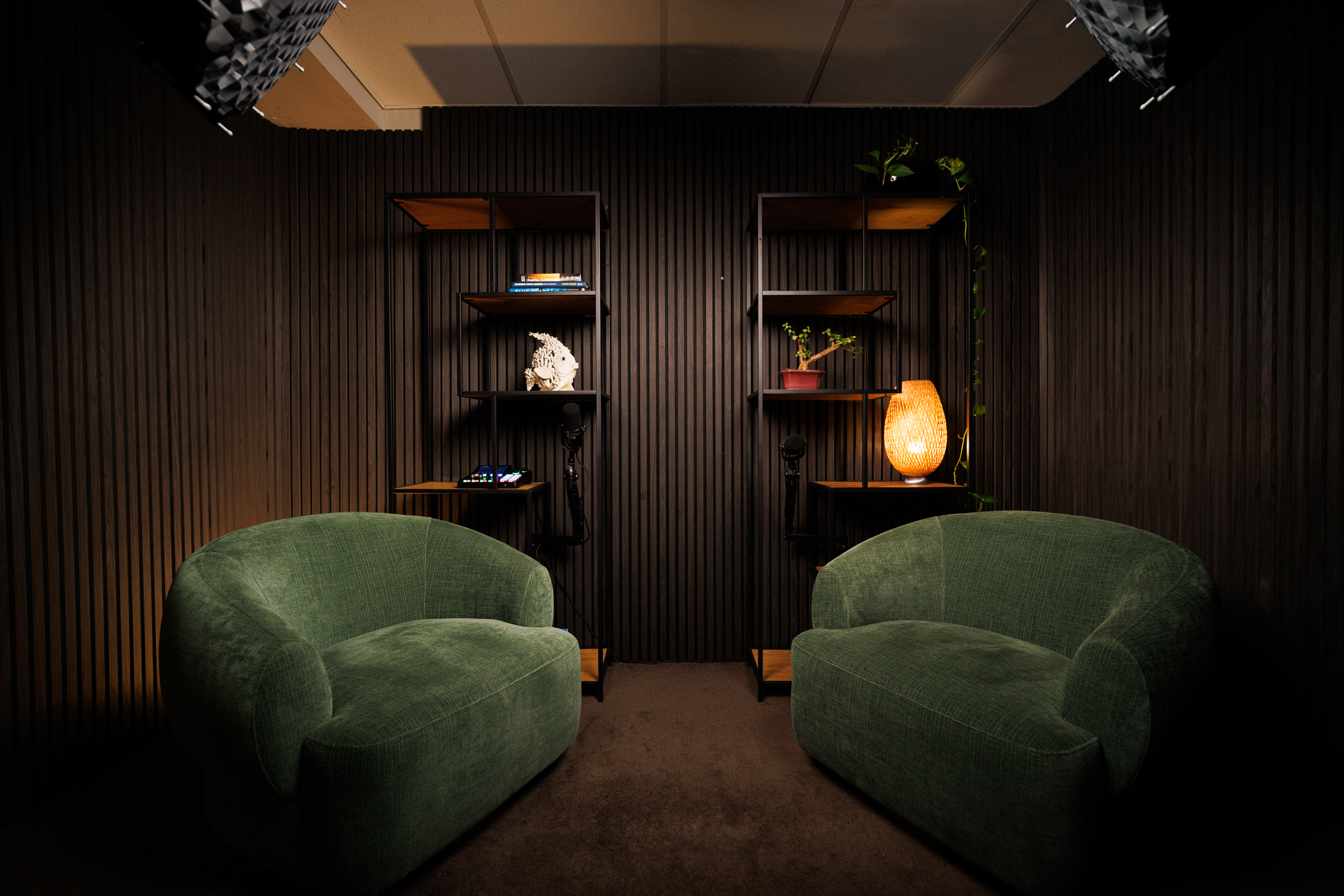 Set up for two people, the studio is ideal for one on one podcasts and interviews, with professional audio and cinematic video ready every session. Whether you are a first time podcaster or a seasoned creator, you can record with the ocean nearby and studio grade gear at your fingertips.